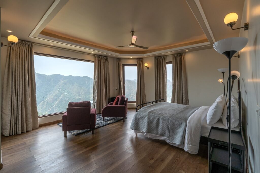 The room is inspired by the boutique stays of Bali with a clean and minimalistic vibe. The room comes with a shared washroom, working desk, cupboard and a panoramic bedside view of the mountains.